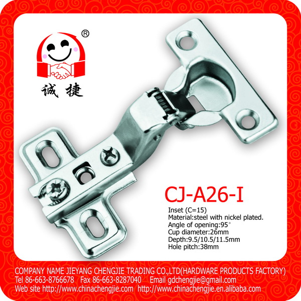 產品描述: 開門角度:105° 鉸杯尺寸:26mm 鉸杯深度:9.5/10.5/11.5mm 鉸杯孔距:45/48/52mm 適用門板厚度:12-22mm 門板K距離:3-5mm 性能:深度調節(jié)±2毫米 高度調節(jié)±2毫米 蓋門調節(jié)±4毫米 包裝細節(jié): 1)散裝:200只/箱,250只/箱,300只/箱 2)只含螺絲/袋裝,100只/箱 3)彩盒包裝/根據(jù)客戶需求 產品單價,具體信息,歡迎隨時咨詢我們!