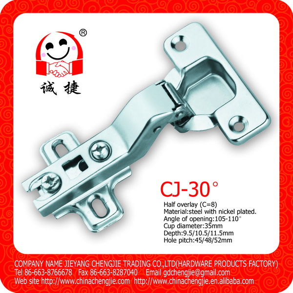 產(chǎn)品描述: 開門角度:30° 鉸杯尺寸:35mm 鉸杯深度:9.5/10.5/11.5mm 鉸杯孔距:45/48/52mm 適用門板厚度:14-24mm 門板K距離:3-7mm 性能:深度調(diào)節(jié)±2毫米 高度調(diào)節(jié)±2毫米 蓋門調(diào)節(jié)±4毫米 包裝細節(jié): 1)散裝:200只/箱,250只/箱,300只/箱 2)只含螺絲/袋裝,100只/箱 3)彩盒包裝/根據(jù)客戶需求 產(chǎn)品單價,具體信息,歡迎隨時咨詢我們!